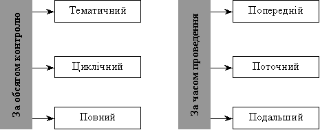 Далі можна навести класифікацію форм контролю за обсягом та часом проведення (рис. 4.3).