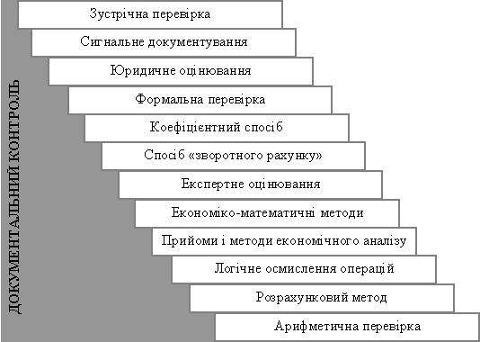 Документальний контроль має значно більше методів та прийомів. Але, як зазначав професор М. В. Кужельний, «прийоми і методи фактичного та документального контролю існують відносно, і такий поділ умовний. Але він необхідний, щоб можна було більш предметно враховувати …взаємозв’язок фактичного та документального контролю і цілеспрямовано працювати над удосконаленням його методики, визначенням функціональних обов’язків економічних та технічних служб щодо здійснення попереднього, поточного та подальшого контролю…» [160, с. 14].